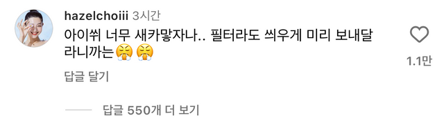'돌돌혜'(돌고 돌아 최혜선)의 주인공 최혜선이 남긴 댓글도 눈에 띄었다. 그는 "아이쒸, 너무 새카맣잖아... 필터라도 씌우게 미리 보내달라니까는"이라며 귀여운 투정이 담긴 댓글을 남겨 여럿의 웃음을 자아냈다.