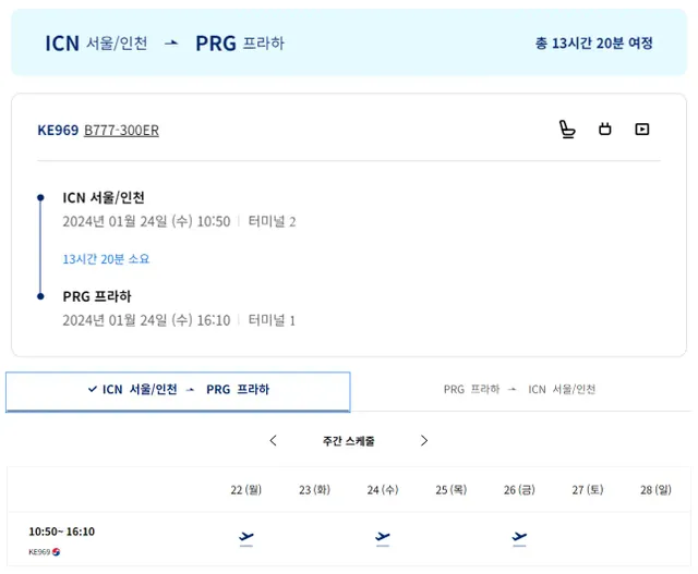 프라하행은 동계 시즌에도 주 3회 운항하고 있습니다