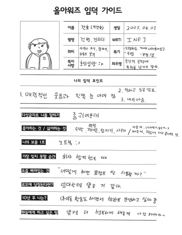 건호 - 말을 안 듣는다기보다는 자유로운 영혼같아요. 규칙에 얽매이는 걸 좋아하지 않고 좀 산만하기도 하고요.