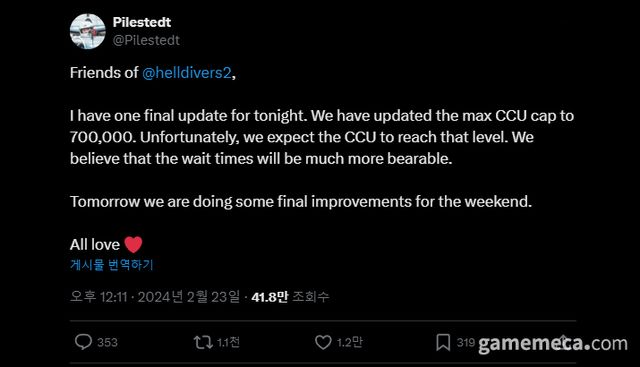 아울러 서버도 보강하며 최대 동시 접속자 수도 기존보다 늘었다. 헬다이버즈 2를 개발한 애로우헤드 게임 스튜디오 요한 필레스테드(Johan Pilestedt) 대표는 23일 본인 X(트위터)를 통해 최대 동시접속자 수를 70만 명으로 늘렸다고 밝혔다. 기존에 45만 명으로 제한된 것과 비교하면 55% 증가한 셈이다.