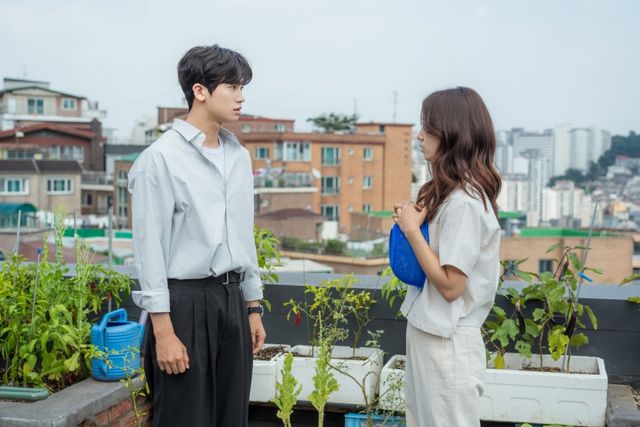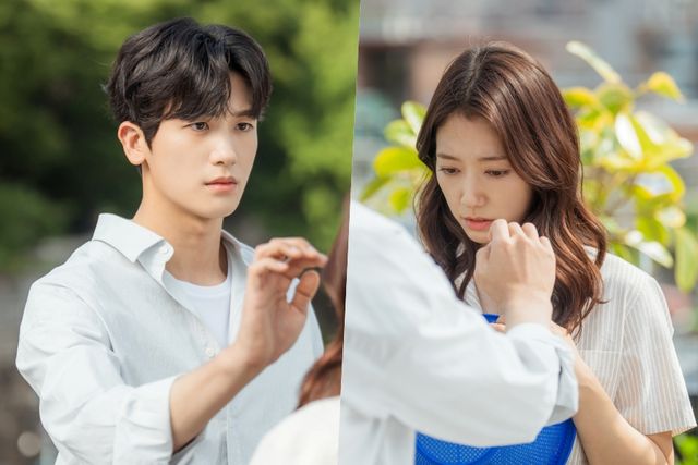 그런 가운데 공개된 사진 속, 옥상에서 마주 선 여정우와 남하늘의 모습이 눈길을 끈다. 마치 14년 만의 재회 모먼트를 떠올리게 하지만 그때와는 또 다른 복잡미묘한 감정으로 일렁이는 두 사람. 여느 헤어진 연인처럼 예기치 못한 만남에 어색하고 당황한 기색이 역력하다. 이어 남하늘에게로 조심스레 손을 뻗은 여정우, 이들의 가까운 거리감이 ‘숨멎’ 텐션을 유발한다. 그의 애틋한 눈빛과 손길에서 ‘아직 헤어지지 못한’ 여정우의 마음이 고스란히 전해진다.