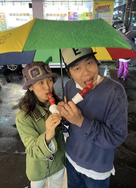 공개된 사진 속 이효리는 이상순과 함께 탕후루를 먹고 있는 모습. 이상순은 딸기 탕후루를 먹으며 카메라를 응시하고 있으며, 이효리는 그런 이상순을 장난기 어린 표정으로 바라보고 있어 눈길을 끈다. 비 오는 날씨에 우산 하나를 함께 쓰고 있어 달달한 분위기를 풍기기도 한다.