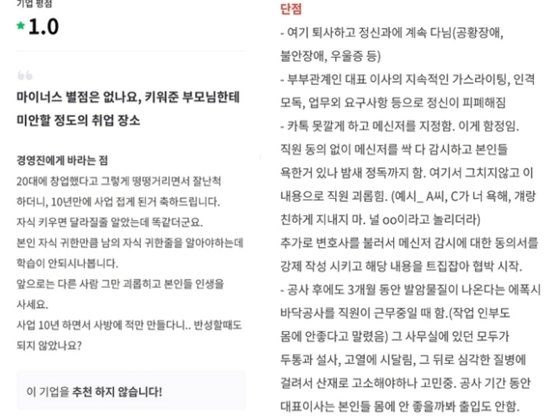 지난달 별점 1점을 남긴 전 직원은 "여기 퇴사하고 공황장애·불안장애·우울증 등으로 정신과에 계속 다닌다"며 "부부 관계인 대표이사의 지속적인 가스라이팅, 인격 모독, 업무 외 요구사항 등으로 정신이 피폐해졌다"고 주장했다.