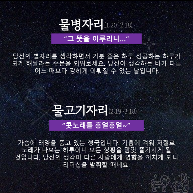 당신의 별자리를 생각하면서 기분 좋은 하루 성공하는 하루가 되게 해달라는 주문을 외워보세요. 당신이 생각하는 바가 다른 어느 때보다 강하게 이뤄질 수 있는 날입니다.