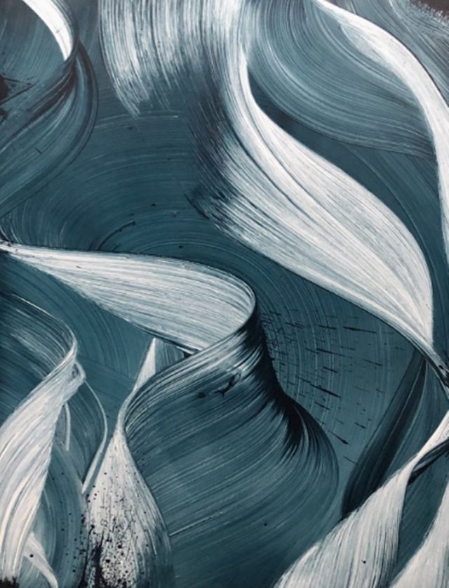 이번 전시에서 선보여지는 ‘바다의 비밀’(Secrets of the sea) 시리즈는 2022년부터 파파코스타스가 작업해 온 것으로 파도가 일렁이는 모습을 추상화하며 일획(一劃)으로 그은 그림들이다. 파도는 작가의 고향인 그리스의 에게해 같은 광활한 바다의 풍경을 뜻함과 동시에 불교의 ‘번뇌’를 상징하는 것이기도 하다.