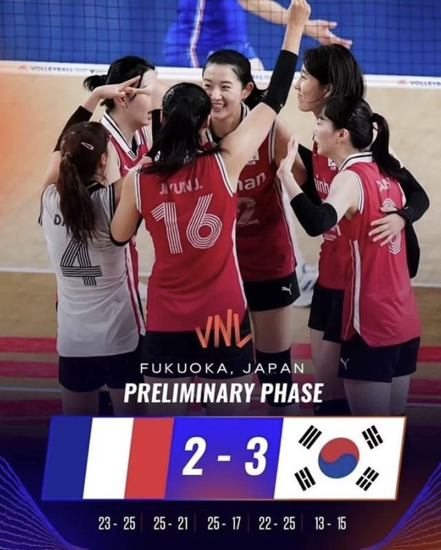한국 여자배구 대표팀이 VNL 3주차 프랑스와의 경기에서 세트 스코어 3-2(25-23, 19-25, 20-25, 25-22, 15-13)로 승리하며 승점 2점을 획득했다.
