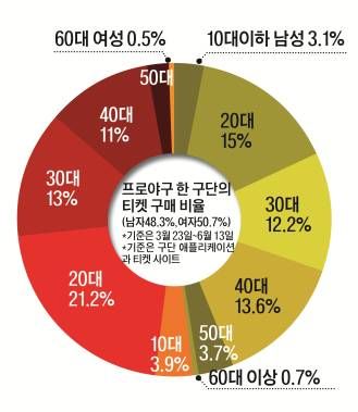 현장에서 주목하는 건 연령과 성별이다. A 구단 관계자는 "20대 여성이 많이 늘었다. 그건 확실하다"며 "구단 유튜브 시청 분포를 봐도 60%가 여성인데 그중에서도 20대 여성이 가장 많다"고 말했다. 한 구단의 경우 올 시즌 구단 애플리케이션과 티켓 사이트 전체 구매 비율의 51.2%가 여자다. 여성의 연령대 중 20대가 21.2%(2위 30대 13%)로 가장 높기도 하다.