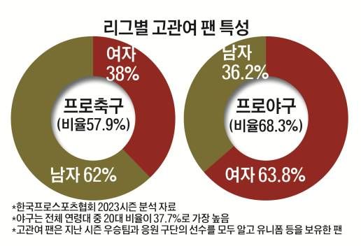 강점이 더욱 부각되고 있다. 한국프로스포츠협회가 지난해 분석한 '종목별 리그 고관여 팬 특성' 자료를 보면 프로야구 관중의 성별 분포는 남성(36.2%)보다 여성(63.8%)이 압도적이다. 고관여 팬은 관심 있는 리그의 지난 시즌 우승팀과 응원 구단의 선수를 모두 알고 유니폼 등을 보유한 말 그대로 '찐팬'이다. 연령별 고관여 팬에선 20대 비중(37.7%)이 가장 높아 '20대 여성 파워'가 간접적으로 드러났다. 그리고 올 시즌, 이 흐름이 가속하는 모양새다.