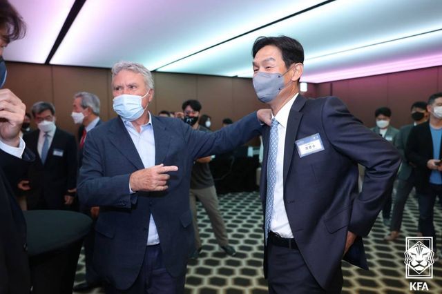 반갑게 대화 나누는 히딩크와 최용수 감독 / 뉴스1(대한축구협회제공)