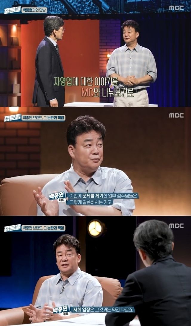 매출 하락이 원인이라고 주장하는 점주들에 대해 백종원은 "우리 입장은 약간 다르다. 공중파에서 우리 입장을 대변하는 거는 반칙이라고 생각한다"라고 말했다.