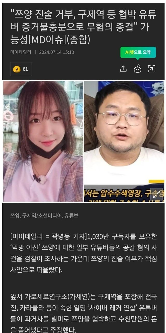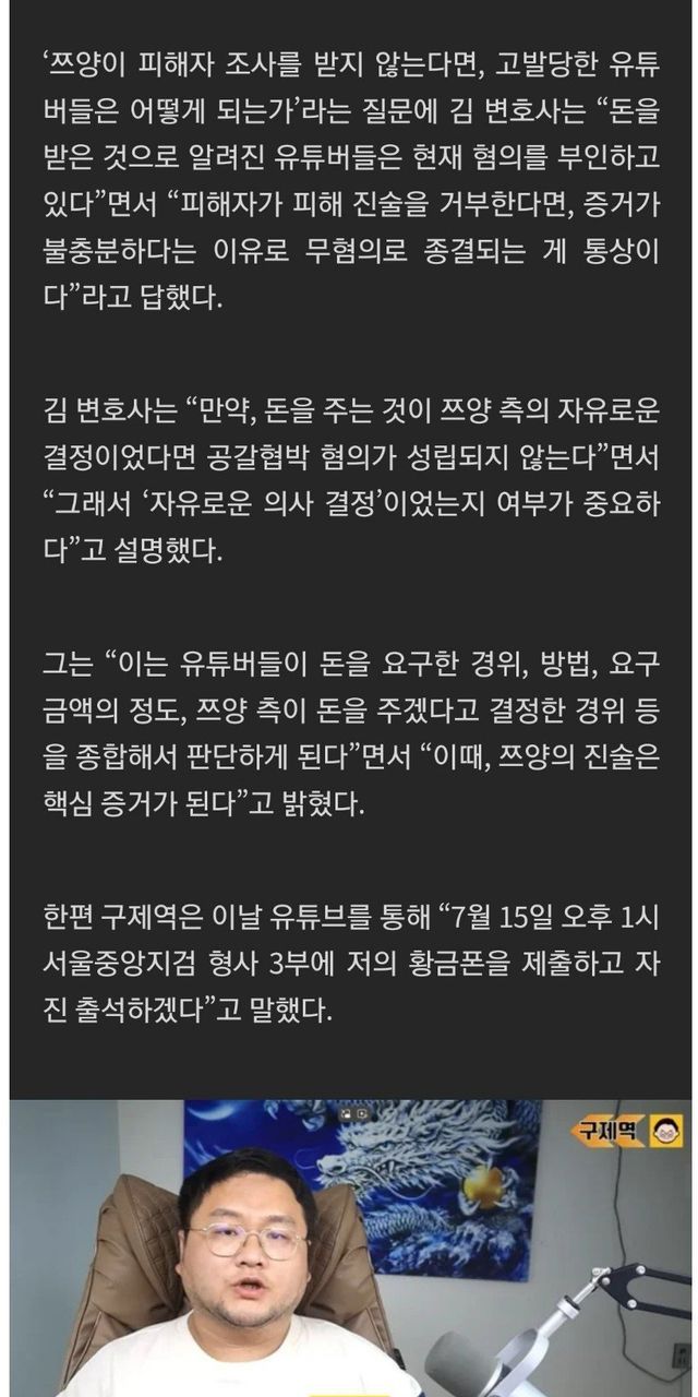쯔양측이 피해진술을 하지않는 이상 제3자의 고발만으로 이를 처벌하기는 힘듬