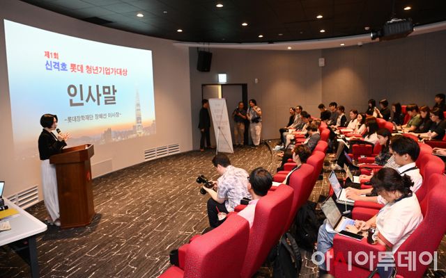 아시아투데이 박상선 기자 = 장혜선 롯데장학재단 이사장이 23일 서울 잠실 롯데월드타워 신격호 기념관에서 열린 '제1회 신격호 롯데 청년기업가 대상' 개최를 위한 기자간담회에서 인사말을 하고 있다.