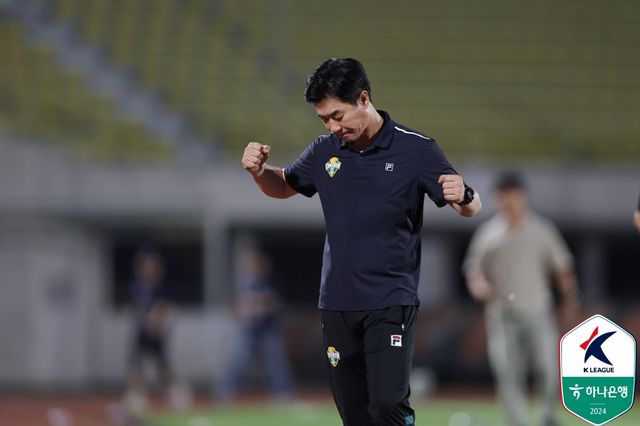 강원 윤정환 감독이 9일 김천 상무와 원정경기에서 2-1로 이긴 뒤 주먹을 불끈 쥐며 기뻐하고 있다. 사진제공|한국프로축구연맹