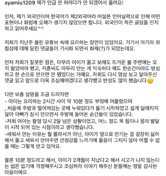 그는 "언급 안 하려다가 안 되겠어서 올린다"며 말문을 열고서 "우리가 지난번 올린 유튜브 속 요리하는 장면이 있었는데, 아이 위험성에 대해 달린 댓글이 화제가 됐다. 우리가 잘못한 점은 아무리 아이가 울고 보채도 뜨거운 불 주변에는 오지 말았어야 했고, 남편도 아무리 안는 게 익숙하다 해도 한순간이라도 방심하고 한 손으로 안으면 안 됐었다"고 이야기했다.