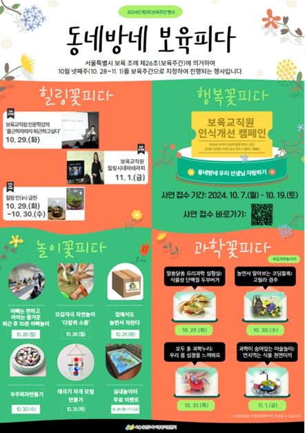 이번 보육주간 행사는 금천구 육아종합지원센터 주관으로, 금천구의 양육 친화적 환경을 조성하고자 ‘힐링꽃피다’, ‘행복꽃피다’, ‘놀이꽃피다’, ‘과학꽃피다’ 총 4가지 주제(테마)로 진행된다.