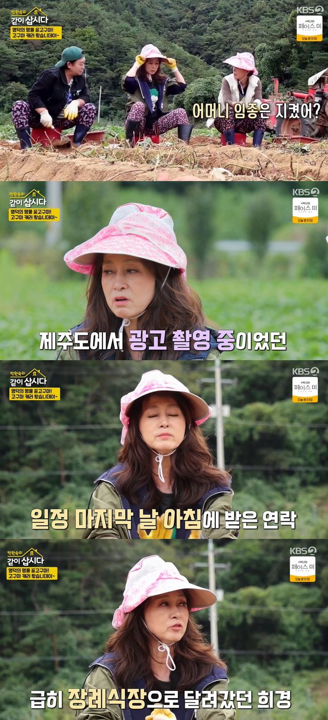 임종을 지켰냐는 말에 문희경은 "제주도에서 CF 광고 촬영이 있었다. 3일동안 촬영했는데 일정 마지막 날 아침에 어머니가 돌아가셨다는 연락이 왔다"며 "그날 제주도에서 밤 늦게 촬영을 마치고 급히 장례식장으로 갔다"고 당시의 안타까운 상황을 회상했다.