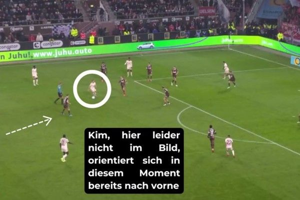 이번에 집중 분석된 한 장면은 바이에른의 가장 최근 경기였던 장크트파울리 원정 1-0 승리다. 김민재는 이날 다요 우파메카노와 짝을 이뤄 최후방을 지켰다. 바이에른이 여러 포지션에 로테이션 시스템을 가동하면서 경기력이 평소보다 약간 떨어졌고, 김민재도 지친 기색이 역력했기 때문에 더 지능적인 수비가 필요했다.