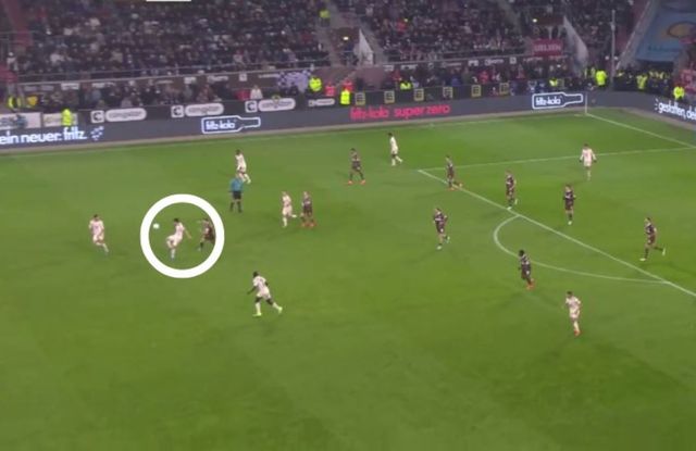 전반 43분 상황에서 바이에른 미드필더 요주아 키미히가 왼쪽으로 치우친 중원에서 공을 잡은 상황이다. 키미히는 짧은 패스를 줄 곳이 없자 반대쪽 측면으로 롱 패스를 해보려 하지만 수비가 읽고 가로챘다.
