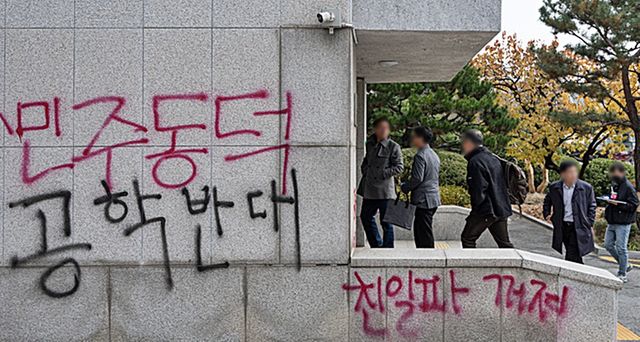 지난 21일 서울 성북구 동덕여대 캠퍼스에 남녀공학 전환 반대를 주장하는 래커칠이 돼있다. / 뉴스1