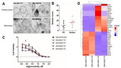 교수팀은 렌바티닙을 장기간 처리하여 ‘표적치료제 내성 간세포암 오가노이드 모델’을 수립한 후, RNA 시퀀싱 분석을 통해 멀티바이오틱스 추가 실험군에서 렌바티닙 반응성과 관련된 1,548개의 차등 발현 유전자(DEGs)를 확인했다.