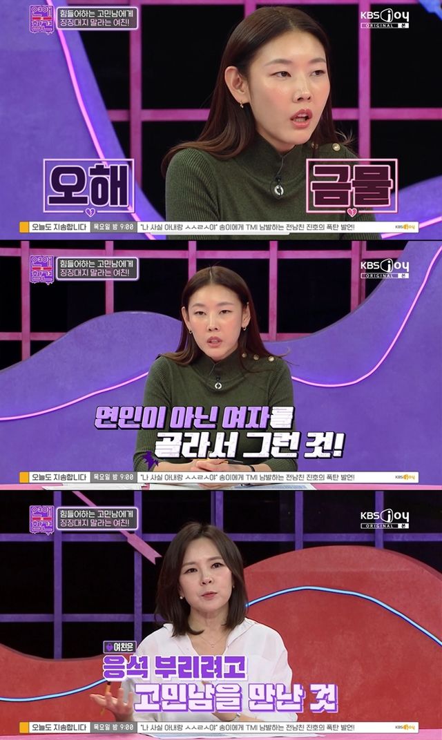 그러면서 "앞으로는 좀 더 바른 인성과 이타심이 있는 여성 분을 고르셔라"라고 당부했다. 곽정은 역시 "응석 부리려고 고민남을 만난 것 같다"라고 봤다.