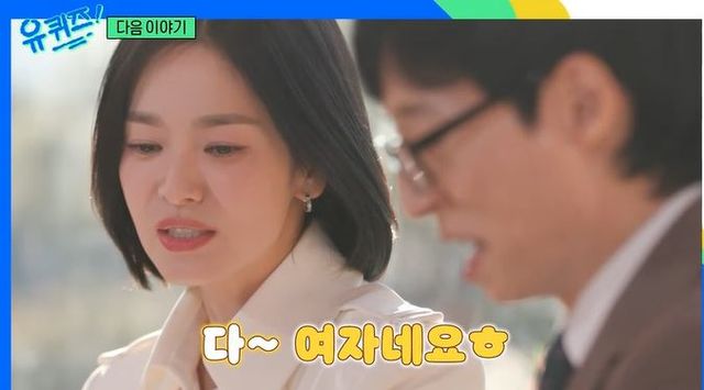 이에 유재석은 "김혜수랑 훌쩍 여행을 떠나고 수지 씨랑 밥 먹고. 인맥이 정말 넓은가보다"라고 말했고, 송혜교는 "다 여자네요"라며 씁쓸한 반응을 보였다. 그러자 유재석은 "시원시원하다. 송직진. 돌려가는 게 없다"고 말하기도 했다.