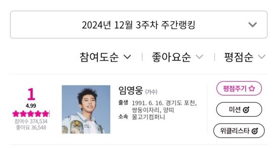 (엑스포츠뉴스 이정범 기자) 임영웅이 12월 3주 차 아이돌차트 평점랭킹 1위에 올랐다.