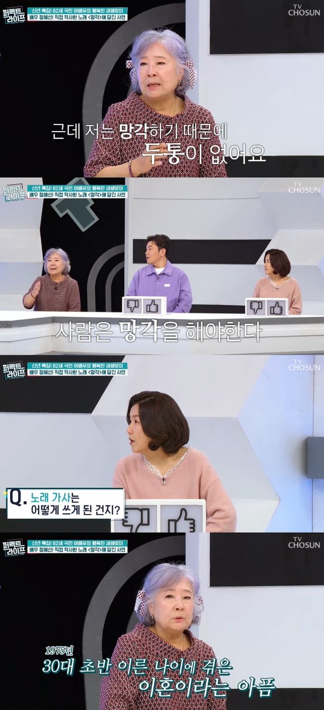 정혜선은 1983년 발표한 노래 '망각'을 직접 작사했다며 사연을 이야기하기도. 그는 "내가 지은 가사다. 인간은 망각하지 않고 머리에 차곡차곡 쌓아두면 맨날 두통이 난다. 근데 저는 망각하기 때문에 두통이 없다"며 철학적인 의미를 강조했다.