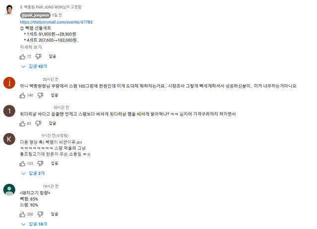 요약하자면 백종원이 빽햄이라는 통조림 햄을 출시했는데 정가 뻥튀기 시켜놓고 할인 엄청 하는 것처럼 해서 판매 중. 따지고 보면 할인 된 가격이 정가지역행사 한철장사 욕하던 사람이라 소비자 기만한다고 더 욕먹는듯 여기에 화난 사람들이 이젠 빽햄이랑 스팸이랑 비교하면서 왜 스팸보다 고기함량도 낮으면셔 가격은 더 비싸냐 논란까지 번짐