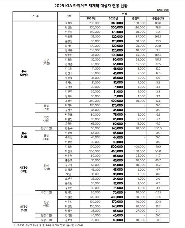 KIA 타이거즈가 2025시즌 연봉 재계약 대상자 45명 중 44명과 계약을 완료했다고 22일 발표했다.