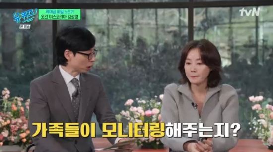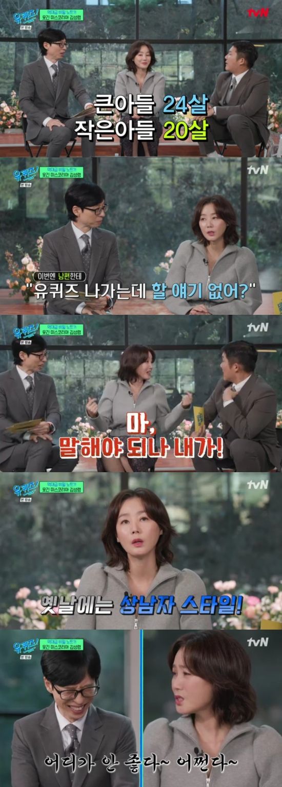 유재석은 "댁에서 아드님께 집에서 자주 듣는 이야기 있냐"라며 관심을 나타냈고, 김성령은 "대화를 별로 안 한다. 저도 '정숙한 세일즈'가 재밌어서 '엄마 방송하니까 한번 봐' 했더니 '아니' 이러더라. 영화 개봉한다고 시사회에 오라 그랬더니 '싫어' 하더라. 제가 남편한테 '유퀴즈' 나가는데 할 이야기 없냐고 했더니 '말해야 되나, 내가' 이래서 '알겠어요' 하고 (통화를) 끝냈다"라며 전했다.