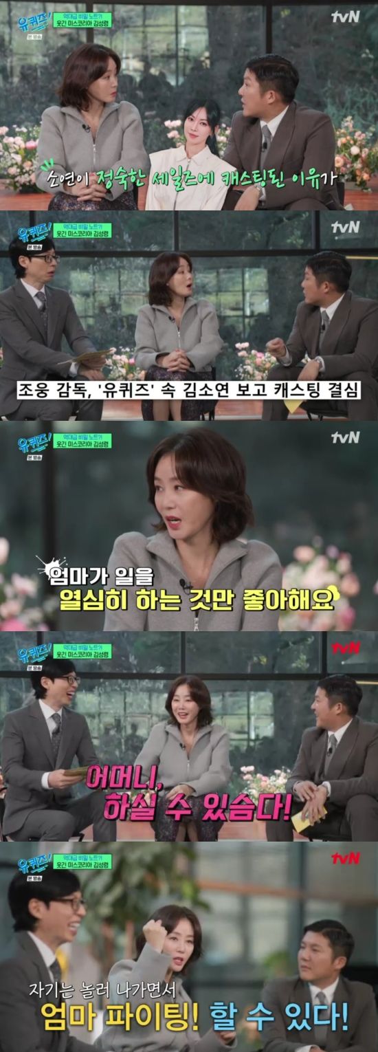 조세호는 "김소연 씨가 '정숙한 세일즈'에 캐스팅된 이유가 감독님께서 '유퀴즈'를 보다가 김소연 씨를 캐스팅하셨다더라. 모르시지 않았냐"라며 귀띔했고, 김성령은 "처음 듣는다"라며 깜짝 놀랐다.