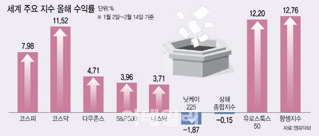 16일 엠피닥터에 따르면 올해 코스피 지수는 7.98% 상승했다. 코스닥은 11.52% 급등했다. 같은 기간 미국 S&P500은 3.96%, 나스닥 지수는 3.71% 오르는데 그쳤다. 닛케이225지수와 상해종합지수는 마이너스 수익률을 기록했다. 국내 증시보다 수익률이 높은 주요 증시는 ‘딥시크 열풍’으로 급등한 항셍지수(12.76%), 유로스톡스50(12.20%) 정도다.