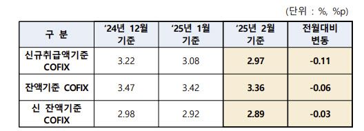 17일 은행연합회 공시에 따르면 지난 2월 신규취급액기준 코픽스는 2.97%로 전월대비 0.11%포인트 내렸다. 잔액기준 코픽스는 3.36%로 한 달 전에 비해 0.06%p포인트, 신잔액기준 코픽스는 2.89%로 0.03%포인트 하락했다.