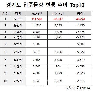 세부적으로 살펴보면 용인시가 1만 1725가구에서 3575가구로 8150가구가 감소해 입주물량이 가장 많이 줄었으며 양주(-7871가구) 화성(-5475가구) 광주(-5207가구) 등이 뒤를 이었다.