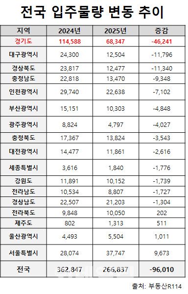 같은 기간 인천은 23.9% 감소(2만 9740가구→2만 2638가구)했고 서울은 오히려 34.5% 증가(2만8074가구→3만 7747가구) 한 것으로 나타났다. 지방까지 합해도 경기도가 감소 물량이 가장 많았으며 대구(-48.5%) 경북(-47.6%) 충남(-41%) 3곳이 감소율은 더 높았다.