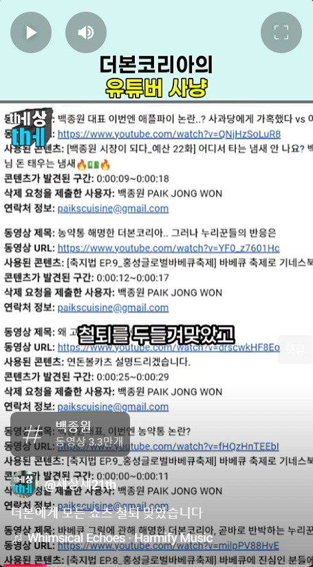 백종원 유튜브의 영상이 노출 되었다는 이유로