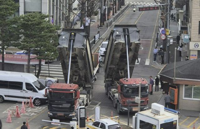 25일 오후 3시께 경기 고양시 덕양구 고양시청 정문에 25t 트럭 2대가 진·출입로를 막아섰다. 시청 정문을 막은 덤프트럭 업체는 지난 2002년 5월부터 고양시 관내에서 ‘노후 상수관로 정비사업’을 진행한 하청 업체로 확인됐다.