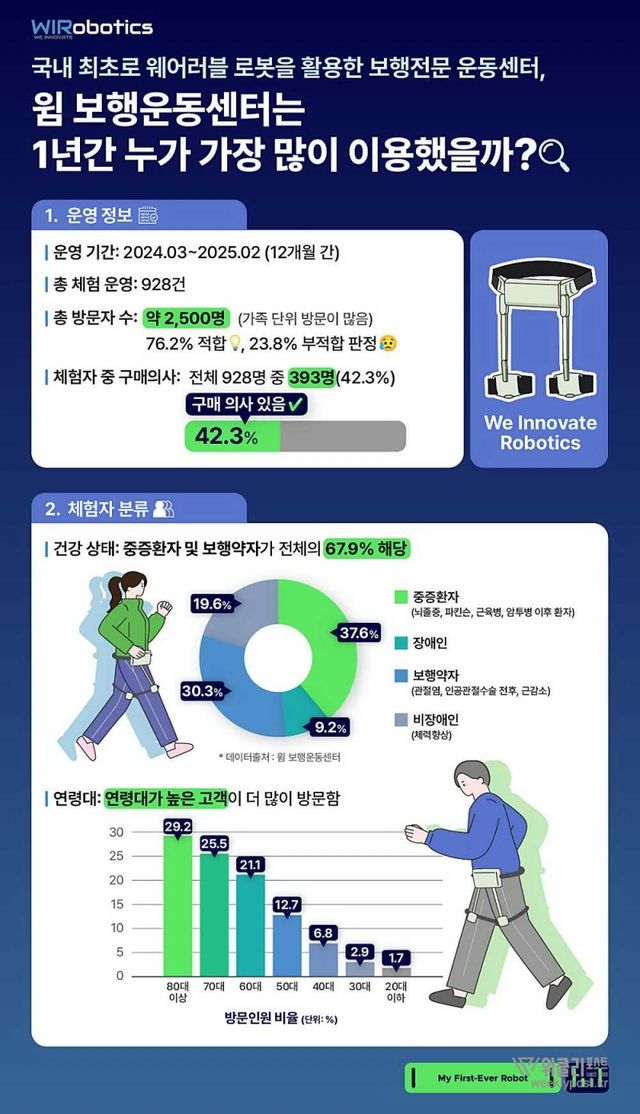 위로보틱스가 서울 윔 보행운동센터의 개소 1주년을 맞아 참여자 데이터를 기반으로 한 인포그래픽을 공개했다. 국내 최초의 로봇 보행 전문 운동센터로, 웨어러블 로봇을 체험하고 직접 구매까지 이어지는 이례적인 수요가 확인됐다.