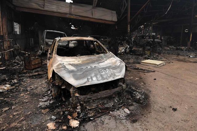 경북 의성산불이 강풍을 타고 영덕군으로 확산된 26일 오전 화마가 지나간 영덕읍에 있는 자동차 정비업체 곳곳에는 불에 탄 자동차들이 남아있다. / 뉴스1