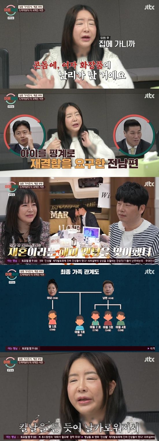 드라마에서나 볼법한 재혼이라는 해피 엔딩을 맞이한 두 사람. 그렇게 꽃길만 펼쳐질 것 같았지만 아내는 "저희 사이가 세상 너무 좋은데 내면은 거의 파국이다. 아이들 이야기가 나오는 순간 칼날을 든 듯이 날카로워져서 서로 이야기를 안 한다"고 털어놨다.