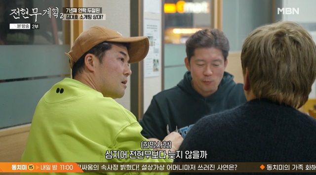 선을 본 적 없는지 묻자, 김대호는 “마지막으로 소개팅 한 여자가 있다. 제가 애프터 신청을 했다”며 “한 번 더 만나고 싶었는데 독감에 걸렸다더라. 낫기를 바라는 중”이라고 털어놨다. 몇 개월째인지 묻자 김대호는 “7년 째”라고 답해 웃음을 자아냈다.