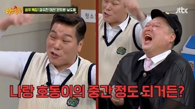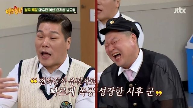 서장훈이 강호동의 출연 장면을 묻자 이상민은 “천하장사가 되는 모습을 본 아이유 엄마가 ‘강호동 엄마는 얼마나 좋을까’라고 한다”고 설명했다. 이에 서장훈은 “시대 자료 화면으로 나왔구나”라며 강호동을 놀렸다.