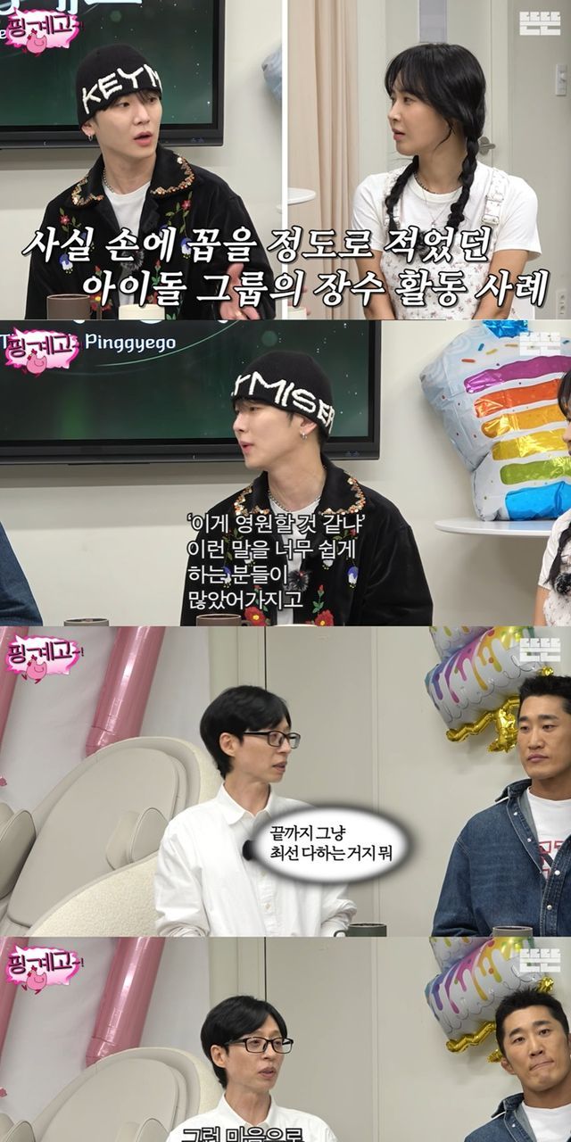 키는 "이게 영원할 거 같냐는 말을 쉽게 하는 분들이 많았다"고 토로했고, 유재석은 "주변에서 너 이거 언제까지 할 수 있을 거 같냐는 이야기가 뭔지 알지만 듣는 입장에선 스트레스다"라고 이야기했다.