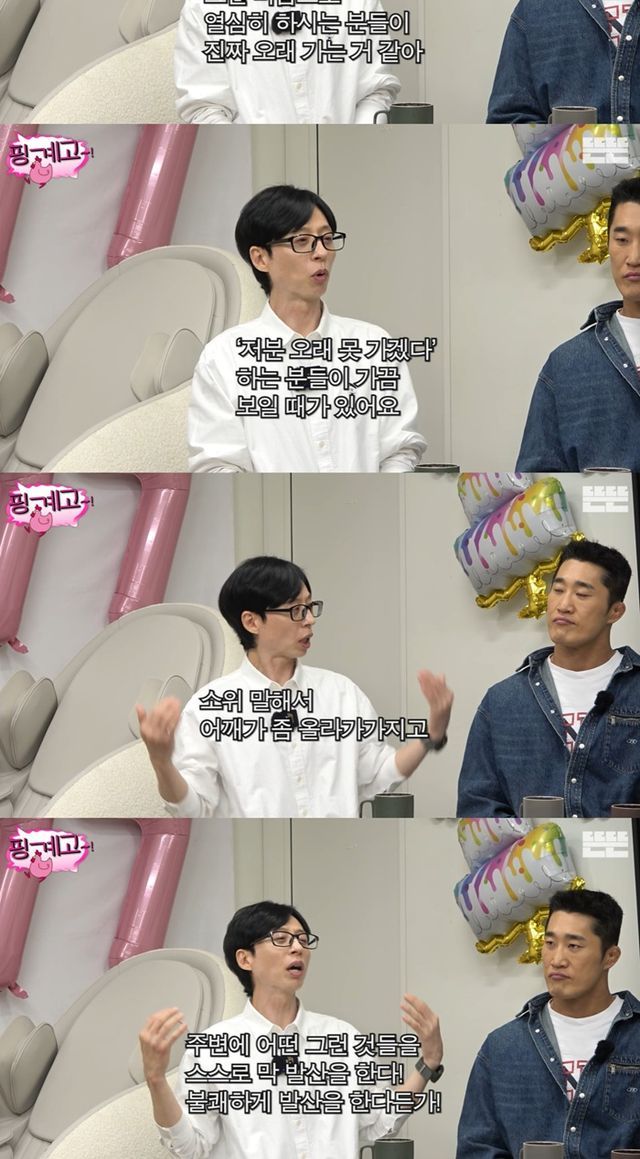 유재석은 "끝까지 최선 다하는 거지 뭐 하는 마음으로 하시는 분들이 진짜 오래 간다. 근데 보다보면 우리도 그런 분들 보인다. '오래 못 가겠다'하는 분들 보인다. 특정 어떤 사람이 아니라 느낌이 있다"고 고백했다.