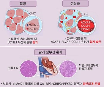 자세히 살펴보면, 심장근육 세포가 손상되거나 기능을 잃는 퇴행성 변화가 나타날 때에는 단백질 분해와 관련된 UCHL1 유전자의 발현이 증가했다. 손상된 심장조직을 회복하려는 과정에서 섬유화가 진행될 때는 염증 반응을 유도하고 섬유화를 촉진하는 특수한 세포 유형이 관찰됐으며, 이들은 ACKR1·PLVAP·CCL14 유전자를 함께 발현하는 특징을 보였다.