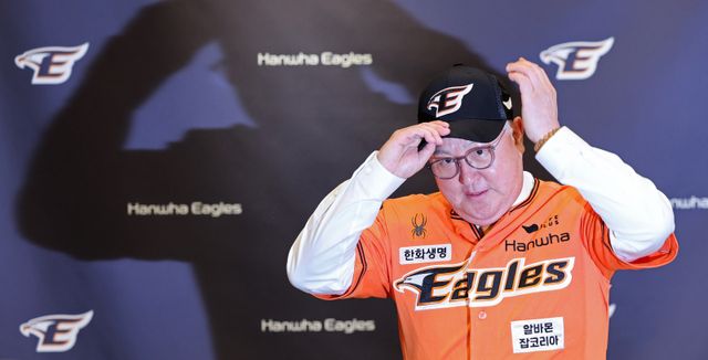 한화 지휘봉 잡은 김경문 감독 (대전=연합뉴스) 김준범 기자 = 한화 이글스 지휘봉을 잡고 프로야구에 복귀한 김경문 감독이 3일 오후 대전한화생명이글스파크에서 취임식을 하며 모자를 쓰고 있다. 2024.6.3 psykims@yna.co.kr/2024-06-03 14:35:25/