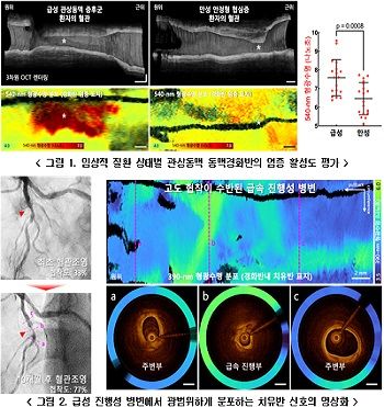예를 들어, 급성심근경색과 같은 급성 관상동맥 증후군 환자에서는 만성 안정형 협심증 환자에 비해 원인 병변의 혈관 염증 지표가 높게 나타났으며(그림 1), 급속 진행성 병변에서는 반복된 경화반 파열과 치유의 흔적으로 인해 치유반이 광범위하게 분포하는 양상이 확인됐다(그림 2).