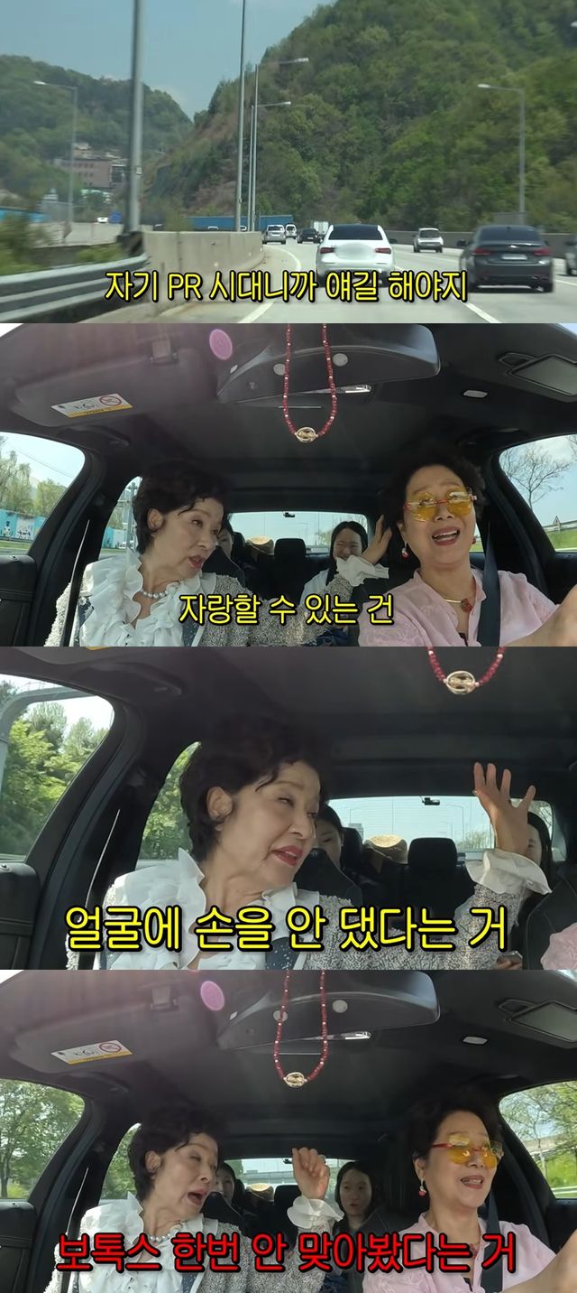 선우용여는 배우 윤미라와 함께 양평으로 향했다. 차량으로 이동하며 윤미라는 "자기 PR 시대니까 얘기를 해야된다"며 "자랑할 수 있는 건 얼굴에 손을 안 댔다. 보톡스 한번 안 맞아봤다. 이 언니나 나나 자연 그대로다. 생긴 그대로 살고 있다"고 자신감을 드러냈다.