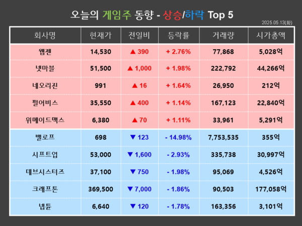 웹젠이 금일(13일) 전거래일 대비 2.76%(390원) 상승한 14,530원에 거래를 마쳤다. 개인이 14,961주를 순매도한 반면, 기관과 외국인이 각각 5,117주, 10,218주를 순매수하며 장 초반부터 반등해 상승장으로 마감했다.